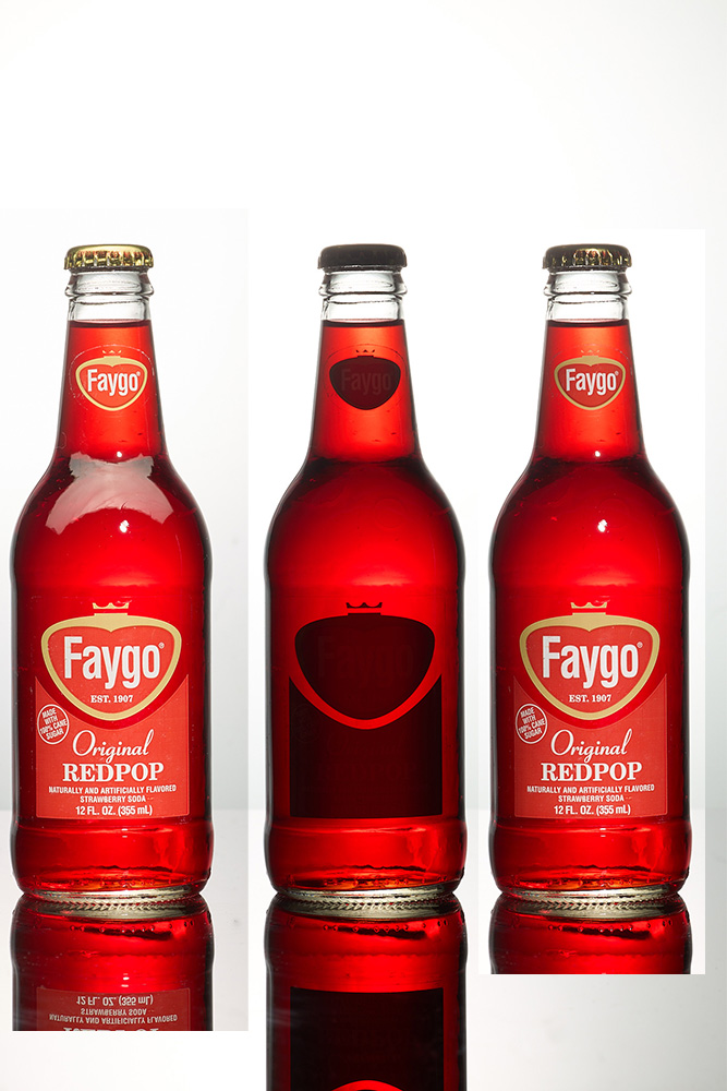 Above you can see three test shots for lighting setup. I took these again after styling the bottle with droplets and ice powder, but I like to get lighting established before doing any bottle dressing. The first shot will only be used for the cap, second for the liquid and main body and third for just the labels. I generally place my liquid shot on the bottom layer and simply align all the layers in a stack. Then I can select all the parts I want from secondary shots with the pen tool and unmask them. You’ll also notice, in the final shot, that I adjusted the position of the top label. They are rarely centered well from the factory.