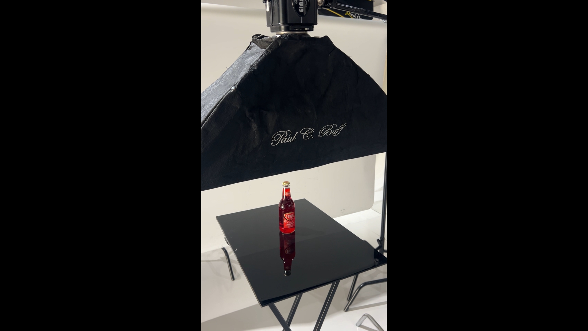 The label light is a gridded strobe, mounted way up high on a stand. Since this light will be hitting the front of the bottle, we want it up high and angled down sharply so that the reflection of the light source in the glass is mitigated as much as possible. There will still be evidence in the form of small highlights, but they will be small enough to clone out in Photoshop.