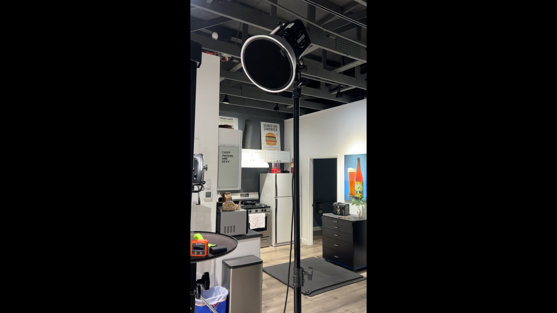 For the bottle cap, a softer light is usually going to look better so I’m using a strip softbox, boomed directly overhead and aimed straight down at the bottle cap. This is going to provide soft enough light to make metal look nice while still being compact and easy to wrangle. You can use a bigger source, but, since our subject is so small, there is no need to do so here.